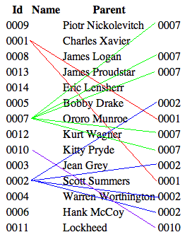 So in essence, transform a table into a tree. I can't properly "sort" this but instead I have to do two passes through the list keeping track of which elements are associated with which ID values and then go through determining the children. So, if my data is an array of JavaScript objects with properties Id, Name, and Boss, my first pass will be: